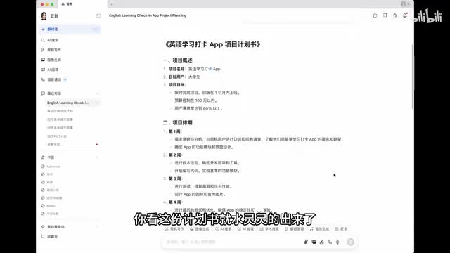 比如说呢我们想要做一个新的项目,那有项目预算,有目标市场,就可以让ai帮我们去起草一份项目计划书。同样把我这段提示字数的豆包pc里。哎,你看这份计划书就水灵灵的出来了。这样我们后续再有什么调整的时候,就比如说有新的用户反馈啊,或者是有预算变化,都可以直接在这段对话里面跟a i更新,就能够生成新的项目计划书了。