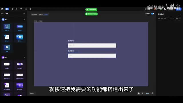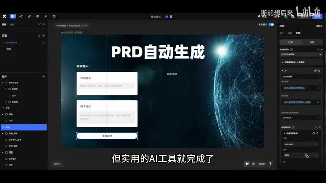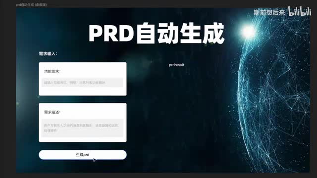 页面呢我就打算是一个极简的页面,有输入框,在这里呢可以输入关键词内容,然后点击生成按钮。所以页面的搭建,我直接用输入框组件加上文字提示和按钮组件,就快速把我需要的功能都搭建出来了。再添加一个页面背景图。是不是有点样子了?不过我希望生成的p r d正文能直接展示在页面的右侧。