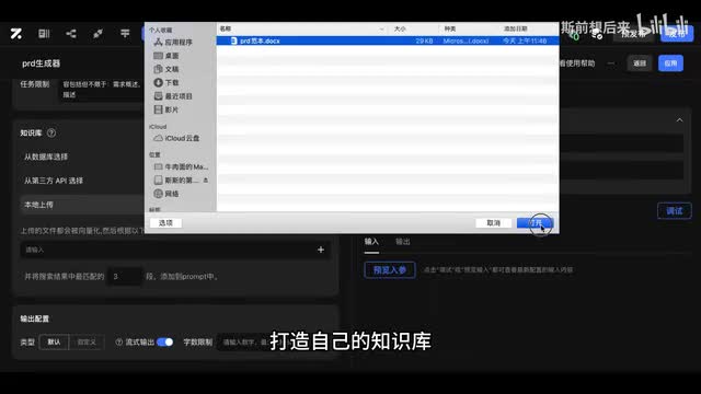 可以根据用户输入的需求关键词内容,写出对应的需求文档。为了让ai产出的需求文档更符合我的要求,我还在这里增加了一些限制。你还可以在这里上传文档,打造自己的知识库,比如上传自己过去写的p r d文档或是p r d范本,这样ai生成的内容就能更符合你的要求了。你还可以在这里进行反复调试,直到a i输出的结果符合你的预期。