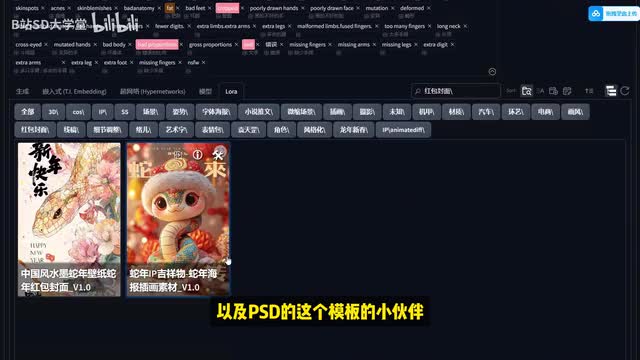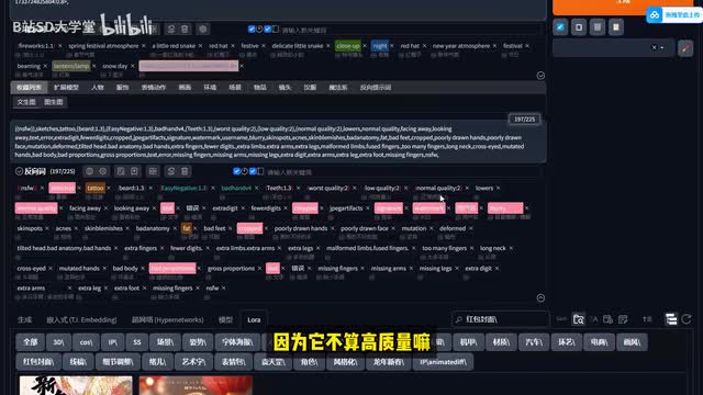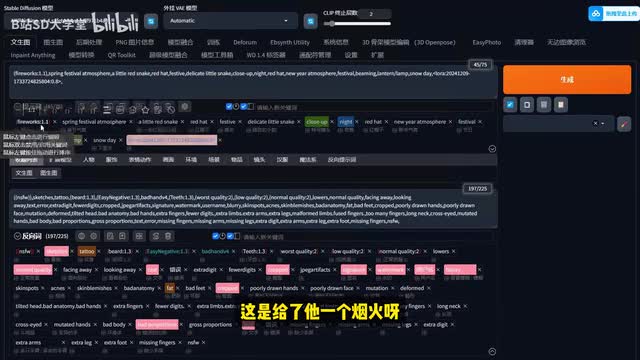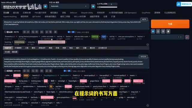 接下来咱们就在纹身图的这个模式中,在正向提示词的部分填入期望得到的画面,在负向提示词中填入不期望得到的画面。那我这里的正向提示词的大概意思我们可以来看一下啊,这是给了他一个烟火呀。春节的氛围主要是一条红色的小蛇,红帽子喜庆的感觉,然后特写镜头夜晚。节日喜气洋洋,灯笼下雪天等等这一些,然后再给它加上了一个laura,能够很好的控制风格的生成。