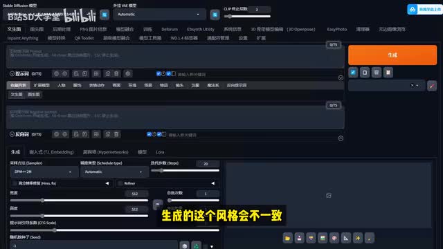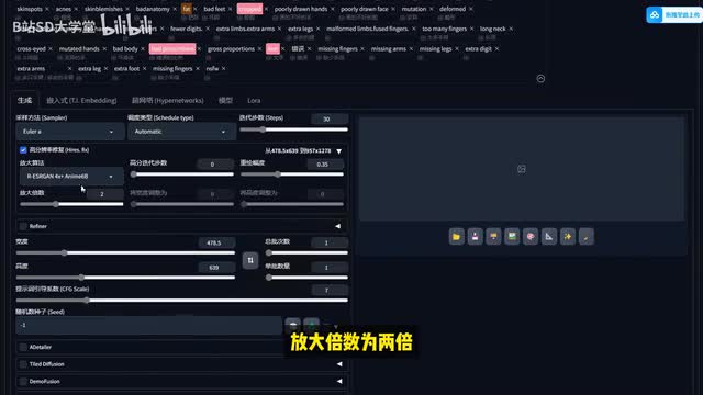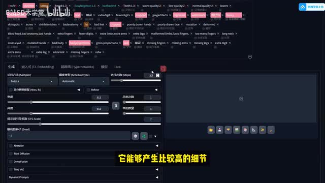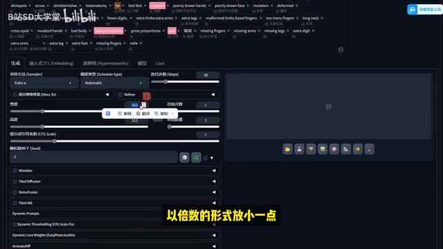 然后点击回车键,它就能以英文的形式来填入到我们的正向提示词里面了。它会自动给我们来进行一个翻译好再来反向提示词这个地方呢就是一些不要的内容,比如说一些裁剪呀、牙齿呀、低质量啊,正常质量也算,因为它不算高质量吗?好,以及痤疮啊、画不好的手等等这些。接下来我们来到最后的一个步骤,在生成参数的部分我们来进行一下调整。这个地方就是对于我们生图的这个画面的大小及生成图片的数量来进行一个调整。
