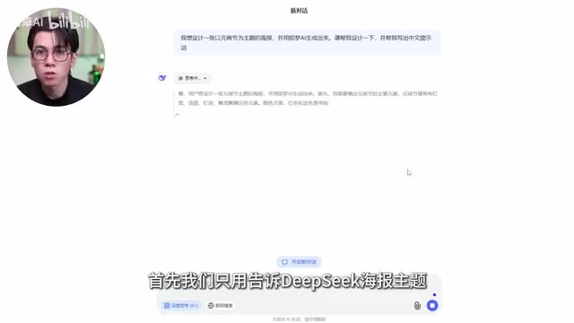 第二个,deep sik加集梦一分钟就能制作出来高品质的中文海报。首先我们只用告诉tip sik e的海报主题,然后让他帮我们设计并且写出提示词。