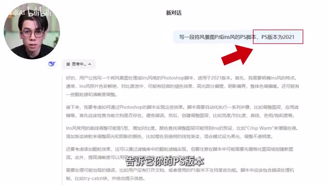 然后是deep sik加p s,让ai帮你p图,跟deep sick说出你的需求,让它生成p s脚本。记得这里啊,告诉他你的p s版本,它就能自动生成出来代码了,然后把代码复制到t s t文档里。
