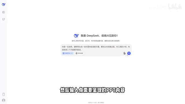 首先打开deep sick,先选择深度思考模式,然后输入你需要呈现的p p t内容,按照这个万能指令模板输入会更准确哦,然后就能点击生成了。