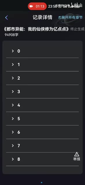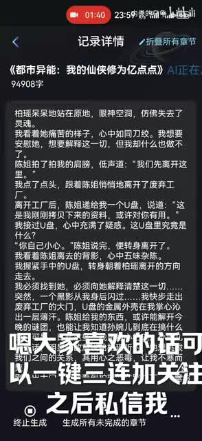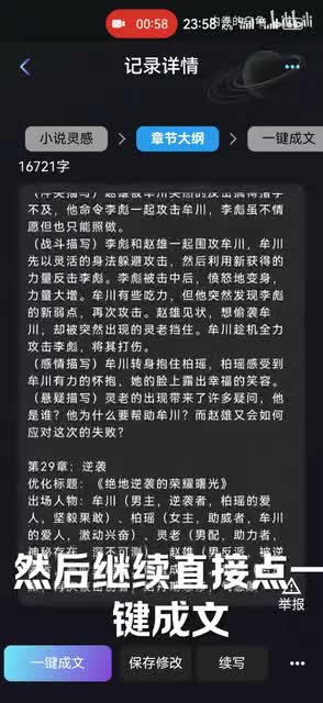 就你就会发现,比如他现已经续写了十六章,再往后就可以看到它一直续写的有。然后继续直接点一键成文,然后直接把它放在原有的记录里边,里边都有选项,然后重新开始生成。