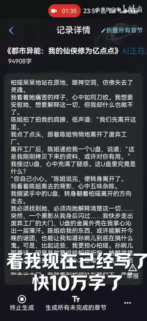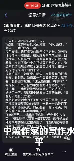 比如我这个里边它先生成到百分之九十四,我已经终止了它,我也可以继续生成。它生成好之后呢,给大家继续继续看一下它的一个写作质量。