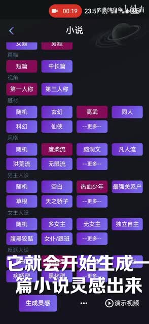 进来之后还是点小说这个,然后看电影里边有非常多的选项,大家根据自己的需要进行选择就行。选择好之后直接点生成灵感,它会更是生成一篇小灵感出来,然后给大家。