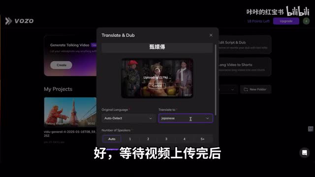 接着选择一下想要翻译的目标语言,向主流的英语、西语、俄语等等都是有的。我选择了一个日语翻译来看看,并且它还能选择说话人的个数,我这里选择自动让他匹配就好,注意这里的视频时间范围是在十五秒到一个小时之内的,超过一个小时或者少于十秒的视频都是无法翻译的。好,等待视频上传完之后,我们就一键翻译,大概等了一分钟的时间就生成了日文效果,底下直接有翻译好的日文文本。如果想说话的角色的唇形和字幕匹配,就直接点击左边的lip sink功能继续生成。目前model的付费套餐相对来说有一些小贵,普通创作者的话是十九到一个月,如果是商用的话是九十九。到一个月,大家也可以按需购买哦。