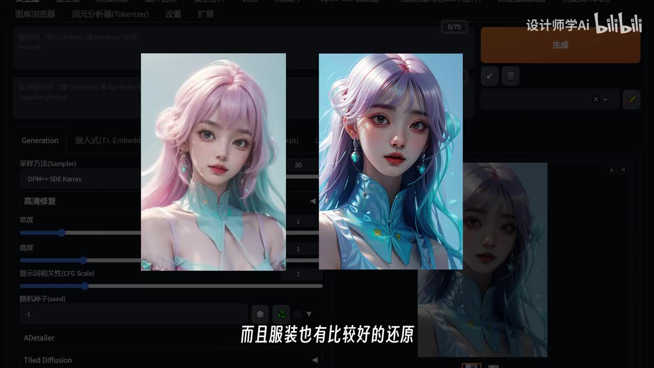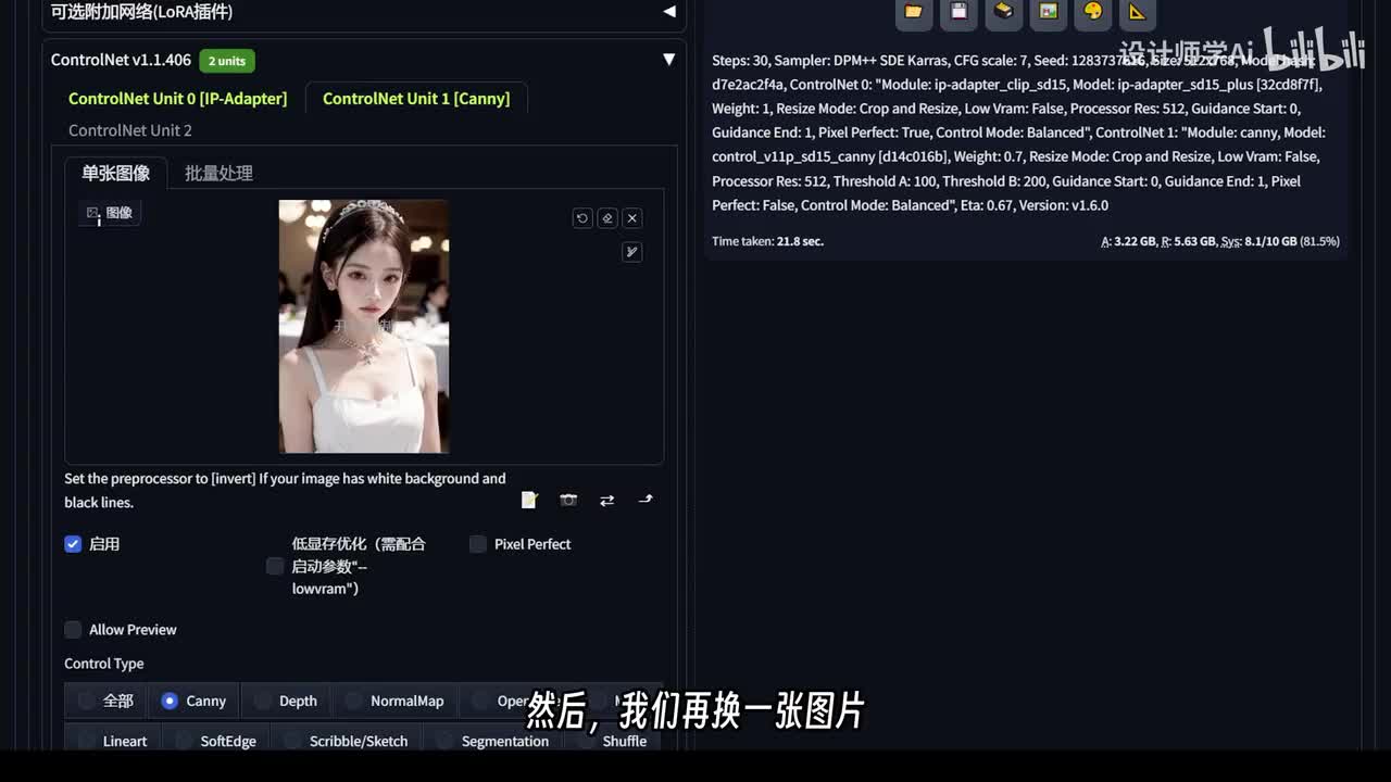 我专门选了一张风格比较明显的内容,然后我们调整预处理器和图片尺寸,最后点击生成按钮。可以看到生成的人物不仅头发颜色、动作姿势类似,而且服装也有比较好的还原。接着我们再添加一张新图片到control net中,选择canny作为控制方式,并推荐把控制参数调低一些,大约零点七,最后点击生成按钮。
