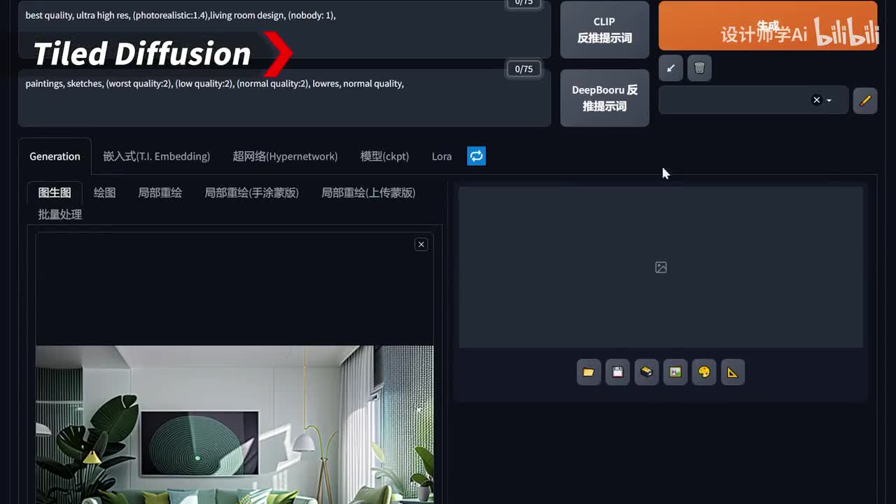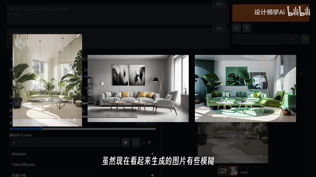 接下来我们演示一下如何制作室内效果图。首先我们选择一张室内效果图,并将其放入control net中,接着选择i p r adapter进行适配,然后调整图片参数和更换大模型,最后直接点击生成按钮。可以看到生成的效果图风格非常接近原图,当然这个拿来直接使用还有一定的距离,所以我再添加一个图作为构图参考,选择dept深度图模型。
