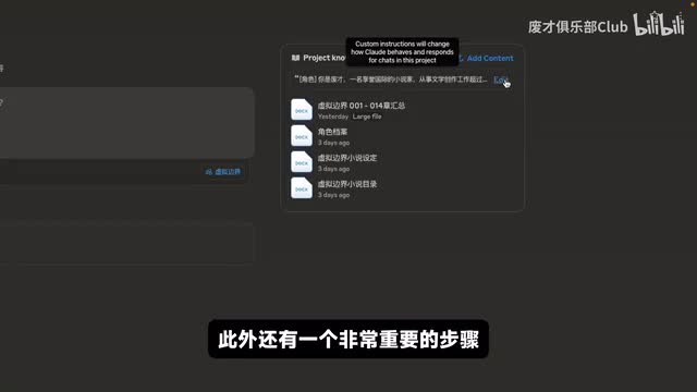 接下来我们直接进入到我已经创建好的小说项目。在这个项目中,我会将章节汇总、角色档案、小说设定以及目录等所有的内容都上传上去。此外还有一个非常重要的步骤,就是把我们之前创建的a i写小说的提示词框架也上传上去。这样在新的对话中,我们就不需要重复的输入提示词,因为提示词已经内置了。
