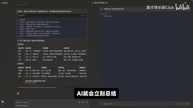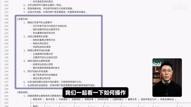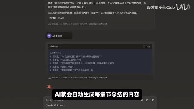 这部分操作非常简单。只需要输入故事总结的指令。a i就会自动生成每一章节总结的内容。总结中包含了每个章节的名称以及剧情。