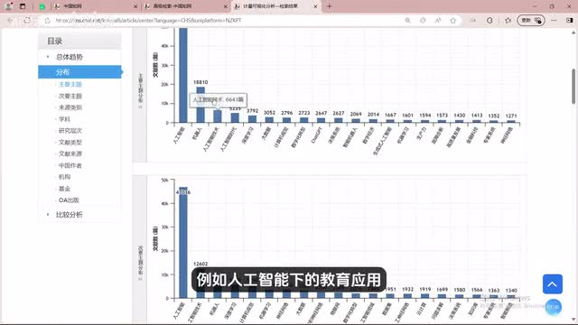 检索后选择导出与分析中的可视化分析,查看全部检索结果,分析主要主题和次要主题,例如人工智能下的教育应用、教育模式等。根据分析结果确定三个核心关键词,比如人工智能、教育应用教学模式。