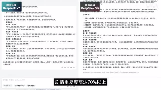 这么简单的一句话测了不下几十遍,不仅测试了官网,也测试了硅基流动和腾讯元宝接入的deep sik v三模型。剧情重复度高达百分之七十以上,故事的模式几乎是固定的。大概就是女主从小受到家庭的轻视,而且还被要求为弟弟牺牲学业去打工。最后离家出走,实现自我价值。