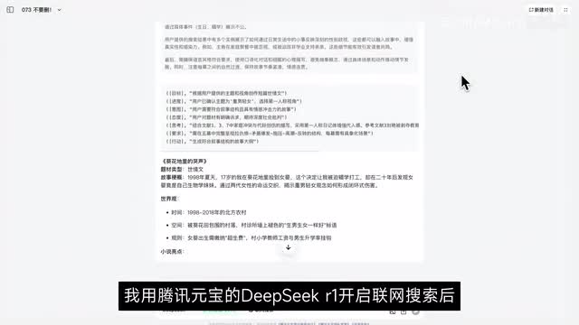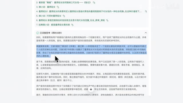 r一的深度思考记录里也显示了它借鉴了文献一莫言的弃婴的情节,同时也参考了文献三五七。本质上,r一是将搜索到的七篇文章的素材进行了缝合重组。这就很危险了,容易被认定为是抄袭。所以当我们用deep sick去联网创作的时候,我们不仅要关注它搜索回来资料的真实性,同时也要去关注那些可能的版权纠纷问题。
