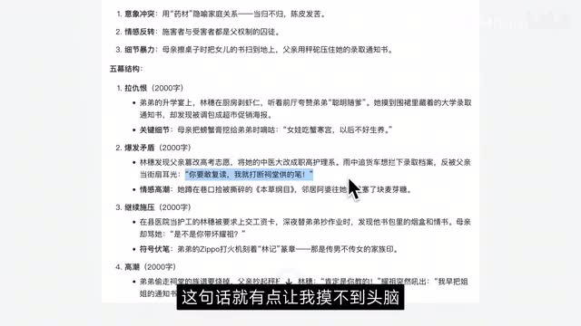 首先我提供了一句话想法,deep sik会根据这句话扩展出完整的故事大纲。这个大纲遵循了世情文的五目公式。拉仇恨,爆发矛盾,继续施压,主角高潮和反转。接下来每一幕都会生成独立的大纲,再根据大纲撰写具体的正文,完成一幕后创建下一幕大纲,如此循环,直到创作完成。