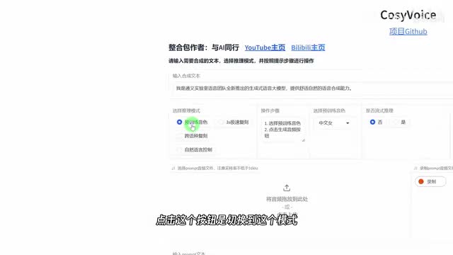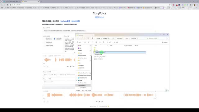 首先我们下载第一个软件,我们下载以后解压出一个文件夹cos voice。打开这个文件夹,找到启动音色克隆,一般就只使用这个。好,打开看到这样一个界面,就是打开成功了。这个软件有两个功能,一个是用它内置好的音色去生成。点击这个按钮是切换到这个模式,然后他要说的话输入在这里,然后这里是切换它的音色。内置的音色我们先直接生成一个。生成好了,听一下我是通义实验室语音团队全新推出的生成式语音大模型,提供舒适自然的语音合成能力。