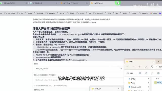 我选取了一段他们密集说话的部分,右击智能前口播,处理好以后,在这里删除非主角说话和空白区域啊,全部删除其他人说话和空白时间。以后可以直接导出,把其他都点掉,只选择音频导出。导出以后打开文件夹,可以看到,这就是我们刚才所处理好的音频。打开这个文件夹,找到这个go web u i b a t,双击打开,看到这样一个界面就是打开成功了。先第一步打开这个u v r五,这一步的作用是把人声和b g m分离。这个界面打开以后先选择模型,一般默认第一个就可以。然后输入我们刚才处理好的文件,直接拖入。