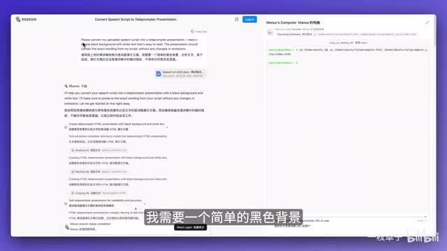 这么一个工具。而原来做这种工具可能要花个几天的时间,但是现在只要说一句话就可以给你生产这样一个动画了。我们再来看这个召集新闻发布提词器提示词是请你将我上传的演讲稿转换为提词器演示文稿。我需要一个简单的黑色背景,白色文字,易于阅读。演示文稿应包含我演讲稿中的确切措辞。不得有任何更改或遗漏。当他完成初步工作之后,有一个等待用户反馈。用户跟他说添加一个控制字体大小的按钮。并将其部署为永久网址。