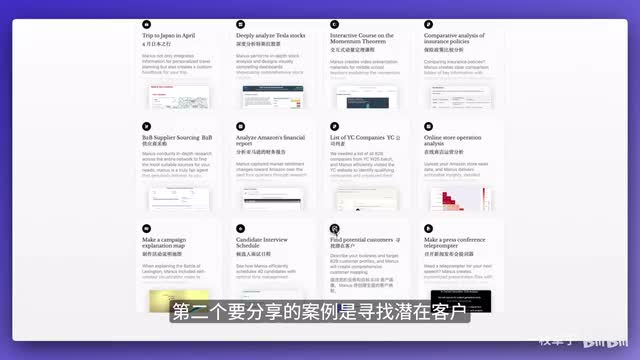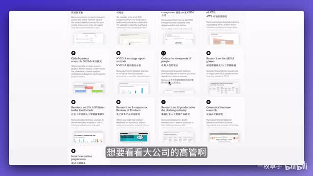 但是现在一句话就可以搞定了,可能在现实生活中很多助理也没有办法做到这么贴心,这么细致吧。所以总之一句话,大模型只是产生想法,而minus交付结果。接下来我们来看看它具体能做什么。由于现在还没有开放很多测试名额,所以我们今天都拿官网给的例子来去分析。涉及到的领域主要有商业数据分析、研究、教育和生产力这五个方面。我会各拿一个例子来去演示展示它的能力。现在我们就来到了minus的主页。在上方你可以看到。他给了你一个示意视频,我a i。
