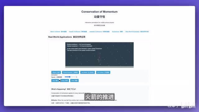就像我们上学的时候老师给我们演示的那样,这里还可以调整。蓝色球体的质量,最后还有。实际生活当中应用的例子像台球。火箭的推进。冰上滑冰者。汽车的碰撞。都是可以帮助学生更好的去理解什么是动量守恒。这是一个非常可以帮助老师去制作更。形象课件儿的。