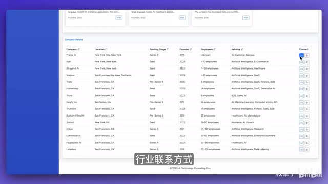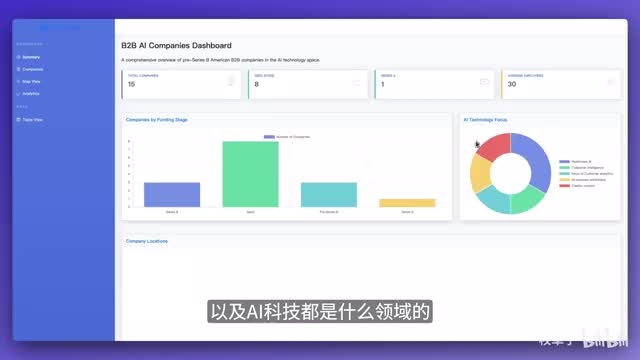 所以他想要让你采取一些行动,比如说做一些限时抢购的活动啊,电子邮件活动啊和一些预期影响的预估。它不仅能够提炼关键的洞察,还能给出具体的支持销售增长的解决方案。比如说复制卖的好的销量的日经验,销量最差的那天搞促销,还有如何提升复购率,具体的实施时间和进度规划。总的来说他是一个非常合格的店铺运营分析的人员。如果我是一个老板,我收到这样的员工给我的分析,我一定觉得这是一个非常好的员工。第二个要分享的案例是寻找潜在客户。我们看一下它的提示词,他说我们是一家专注于通用人工智能领域的技术咨询公司,请为我们创造一份潜在客户表格。目标公司是处于b轮前发展阶段的b to b美国公司,需要人工智能技术赋能,列出至少十五家公司,明确他们的联系方式、公司业务介绍地址和其他细节。制作一个仪表盘,我们来看一下它的结果是否符合给他的要求,是一个非常清晰的呈现的一个数据看板。