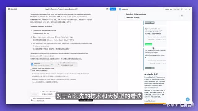 最后给出了一个提词器的工具,我们点开以后发现它下面可以调节速度,还可以调节字体的大小。因为网址是可以通用的,所以我可以把网址复制到我的ipad上去,让ipad充当我拍摄时候的提词器。这样很简单的一个提词器的开发,我只需要一句话,等个几分钟就可以做好了。如果你是一个自媒体从业者,或者是你想要分析某一个社会热点,想要看看大公司的高管啊,或者是。大学教授怎么说?这里有一个收集人们的观点。你可以问他。编制一份全球关键人工智能影响者的详细名单,收集来自领先人工智能公司高管、投资者、政府官员和研究人员对deep sik r一的看法。他的结果是一个h t m l形式的一份文件。先给你概述了一下关于deep sik r一简单的一个介绍,还有他的关键的特点,以及一些高管的观点。