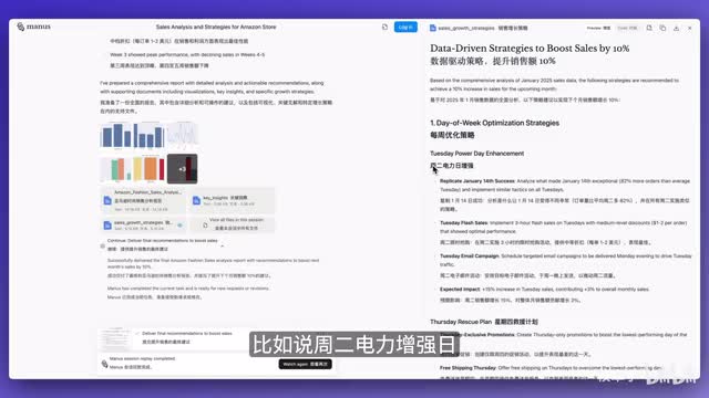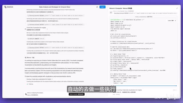 this isn't just another chat out workflows. 这是他们的官方人员介绍。什么什么minus。我们可以往下滑到这个use case gallery,它是用户使用范例的画廊,里面详细的列举了官方给出的玩法。首先我们来看一个商业领域很有用的一个玩法,就是这个在线商店运营分析。点击它以后等三秒我们可以看到左侧,就是当我们给它提供一个提示词,并给它相应的数据表格以后,它就会按照我们的执行自动的去做一些指令。注意哦,它是全自动的在操作,右边是它操作的时候的详细的一个过程。好了,结束了,我们先返回看一下他的指令是什么。他说这是我上个月亚马逊店铺的销售数据,你能用可视化的方式对其进行彻底的分析,并推荐具体的数据驱动策略,以提升下个月的销量百分之十吗?接下来他就给他的一个二零二五年一月的销售的数据表。然后我们可以看到他会有整个的一个分析链路,他先干嘛再干嘛。