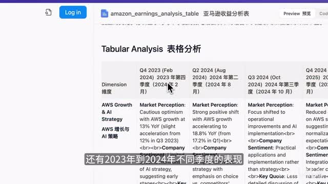 还是先来看一下提示词,分析亚马逊过去四个季度的财报电话会议记录,用具体的证据来去佐证所有的洞察。最后以表格的形式分析结果。我们可以看到它给出了亚马逊收益分析表,点一下来到了右边的这个板块。首先是一个介绍,这份介绍告诉你本报告分析了什么,具体是讲什么的。在下面的表格分析当中,清晰的给你列举出了表格的各个维度,还有二零二三年到二零二四年不同季度的表现。最后是一个整体趋势的总结,全程都非常的清晰,最后还列举出了关键的发现。其实这和我们平时在公司汇报是一样的。我们看右上角有三个按钮,第一个是导出为p d f,点一下它就会以p d f的形式让你存储到自己的电脑里。点复制它就会把所有的文字都复制下来,让你再粘贴到你自己的文档里进行修改。
