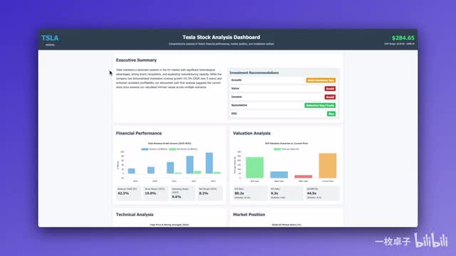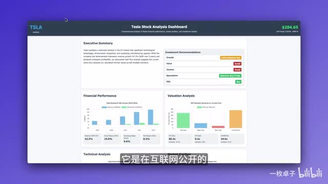 用户就会说,做得好,请给我制作一个仪表盘,就是数据看板。他又开始。操作了。他说,哎也做好了。他说,请开发为公开的。网址问用户是否允许部署到公共网络,用户点击接受。最后我们看一下它的结果,特斯拉股票分析的数据看板。有一个整体的总结,旁边是投资建议growth就是是否要买进,他说可以持有或者是选择性的购买。价值呢他说avoid避免income收入呢没那么看好,还有其他的一些维度。