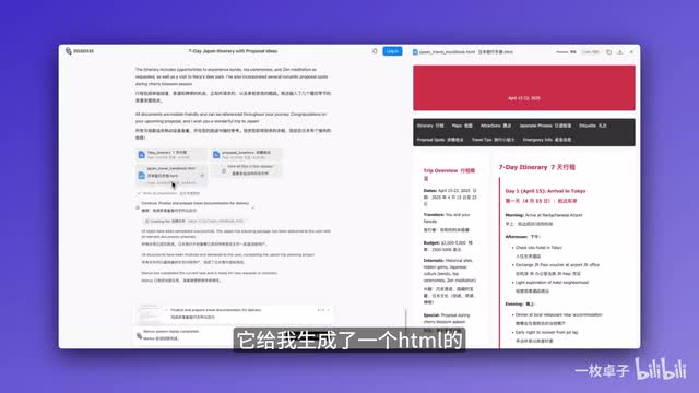 但是同样的一个提示词,如果我给minus的话。他给我的结果。非常惊艳了。就。他给我生成了一个h t m l的。日本旅行手册啊,这个像网页一样是可以交互的。有形成。在左边。有形成概览。