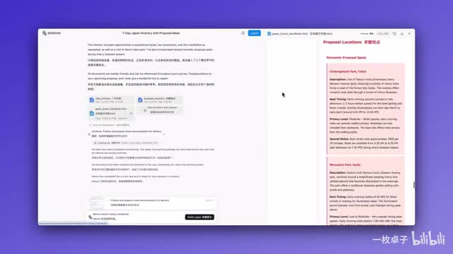 还有快速参考,比如说。汇率是多少?时差是多少?当地的天气怎么样?四月适合穿什么样的衣服?有地图,这个地图它直接引用了谷歌地图,还有景点东京、京都、奈良可以点击选择的,给了你的最佳参观时间。门票在提示词当中,我跟他说是想要和我的未婚妻求婚的,所以这里有一个求婚地点的建议。在求婚地点里面还有一些特别说明,比如说船的租赁费用都是多少,让你即使没去过这个地方,但是通过他的信息已经大致了解了这儿的消费水水平啊,物价呀什么的。啊,最后还有一些旅行小贴士,怎么支付啊?还有交通。需要带的东西。最后是一些紧急联系方式。原来我自己做过这样的旅行手册。起码需要花一整天的时间。