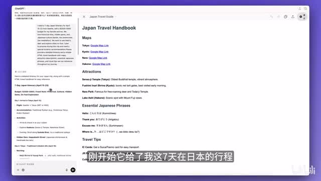 它和现在像deep sik呀、chat g p t这种大模型有什么区别呢?这里我们拿同一个提示词,让他帮忙策划一场日本旅行,来给chat g p t和minus看看它们有什么不同的结果。我们先来看chat g p t,为了让他表现更好一点,我给他了一个提前的指令,告诉他他的身份,他面对的是谁。接下来我把这个指令复制到这里。我们来看一下生成的结果。刚开始,他给了我这七天在日本的行程。根据这个预算来帮我划分了每一天我住在那里,什么活动啊,我的航班我觉得是挺全面的。后面他还开始拿java写了一个h t m l的网页,但是地图我点一下这个链接是点不开的。这里也有一些旅行小贴士,其实总的来说它表现的还算不错了。我们再来看minus生成的结果。