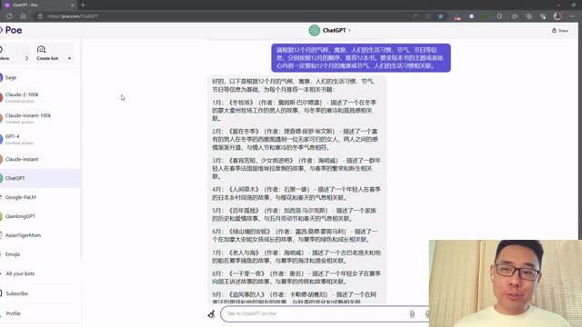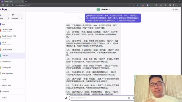 好,那我们用到的第二一个工具呢就是chat g p t。那我们先打开chat g p,比如说我现在想要去做一个呃一年十二个月的一个好书书单的推荐,这样的一个图文的文案。那我就可以在chat p t上的输入这样的一个查询的内容,就是呃请帮我根据十二个月来推荐十二本书的书单。那我希望书的内容呢和月份的寓意啊,节日啊、节假等等的能够有相关。