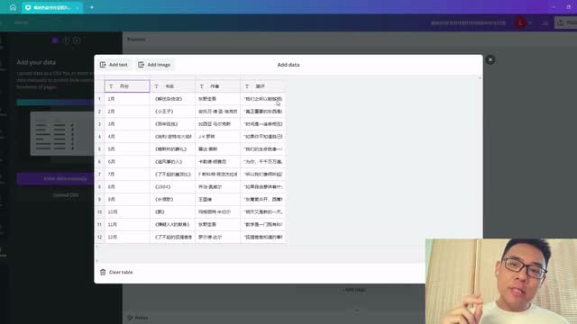 所以到这里边呢,我们就已经做出来了一个完整的有十二个月,有书名、有作者、有简评的这样的一个内容。那现在现在先不要急,因为我们一会儿要去做批量的文本加图片的这样的一个生成的过程,对吧?我们要去做快速的十倍的这样的一个呃自媒体的内容的产生。所以呢这时候不要急,我们还要用chat g p t去帮我们生成这样一个图表。那么因为一会儿我会用到这个图表去批量的生成做图。