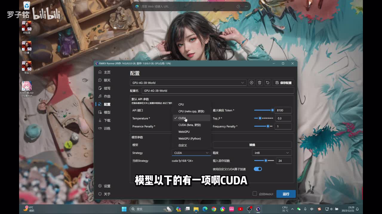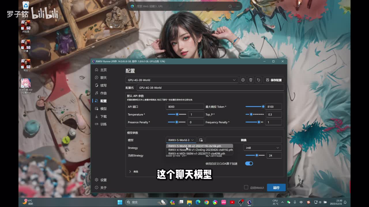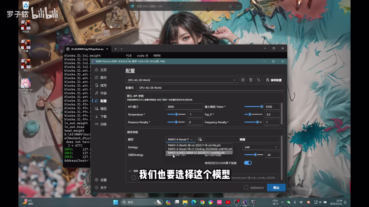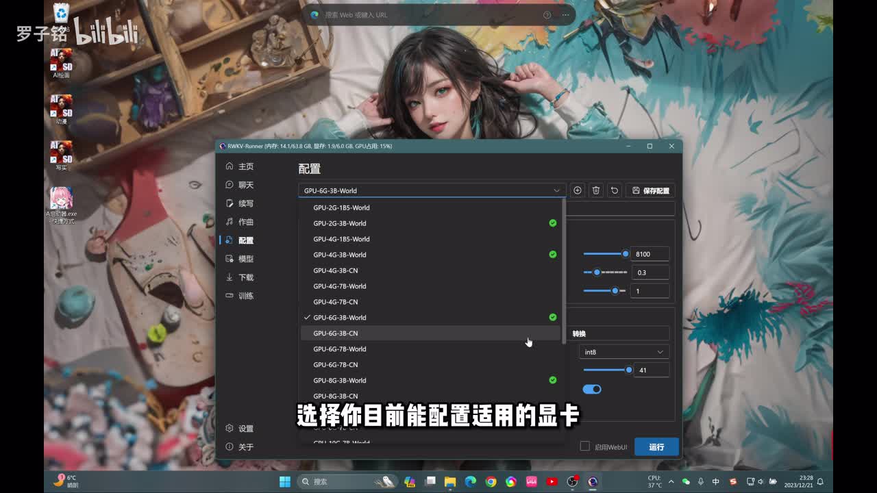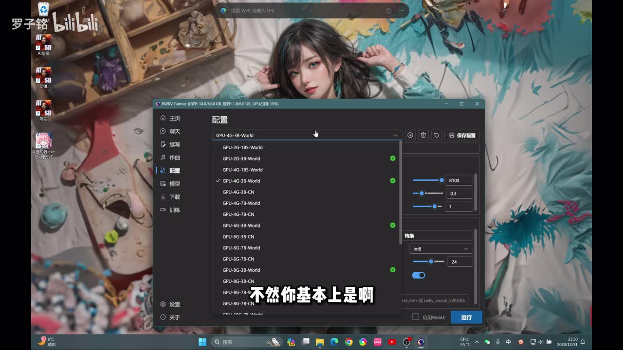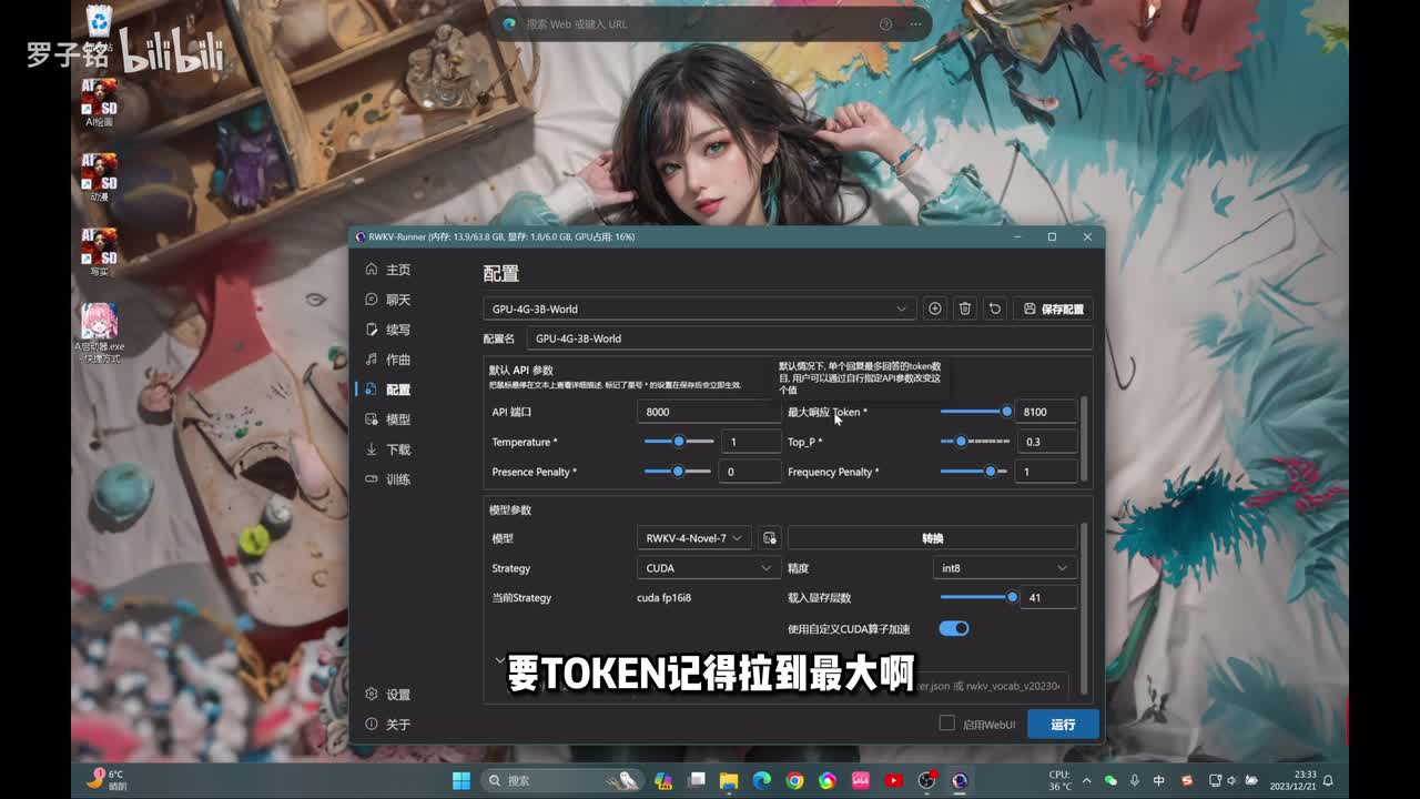 打有绿色勾的,这是我已经帮你们下载好的模型啊,你可以针对自己的显卡来去做。比如说我们现在是不是六g的嘛,我们选择一个四g的,然后这边把token的你调到最大,然后其他的默认这边可以看得到啊。这里有一项啊模型以下的有一项啊c u d a或者选择更快。然后这边模型有三个,第一个模型是聊天的语言模型,第二个模型是写作写小说的一个模型,你可以拿它用来去做,比如说动漫啊、解说,你自己去做一个故事让他去写,或者写一本小说啊去做账号能力都可以的。