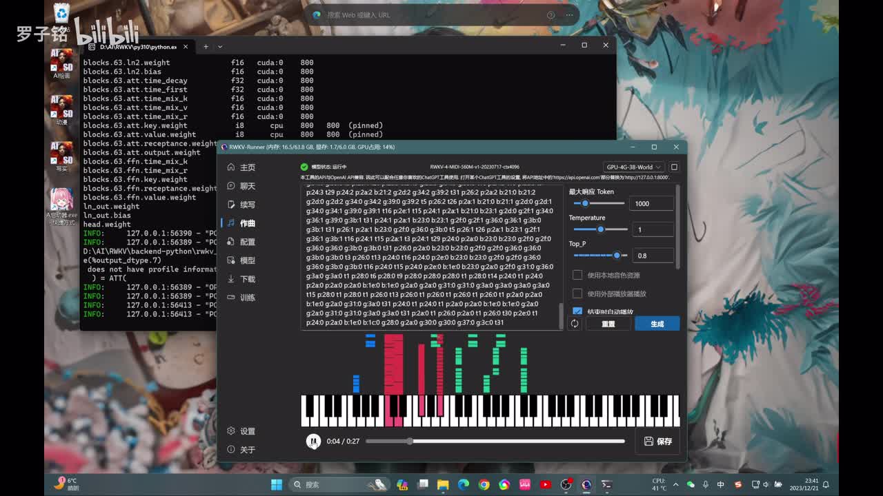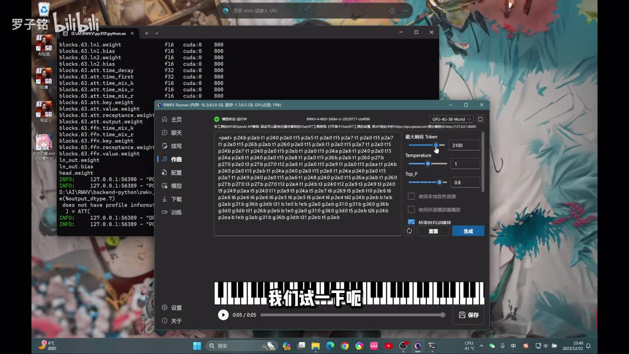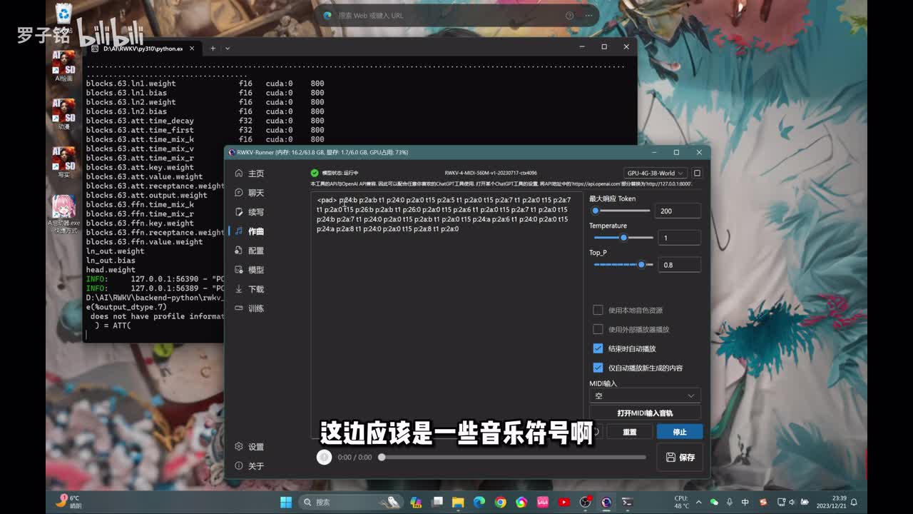 他都能写出来啊,只要你给出这些关键词,它啊比如说什么声音啊,那么波波波波啊啊、鱿鱼,它都能按照你的要求去把这个创作写下来。那么我们来看下一个功能。同样作曲的话,我们也要选择这个模型,要修改一下,然后停止原先的这个模型啊,看一下选择的这些参数都没有问题之后啊,我们点击运行。好,它同样要读取这个呃写作的这个模型,然后它读取完就会弹出这个界面。