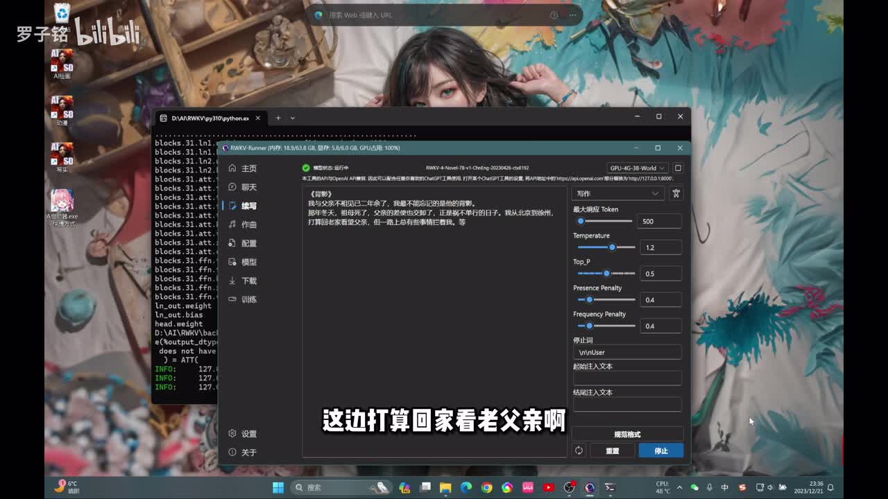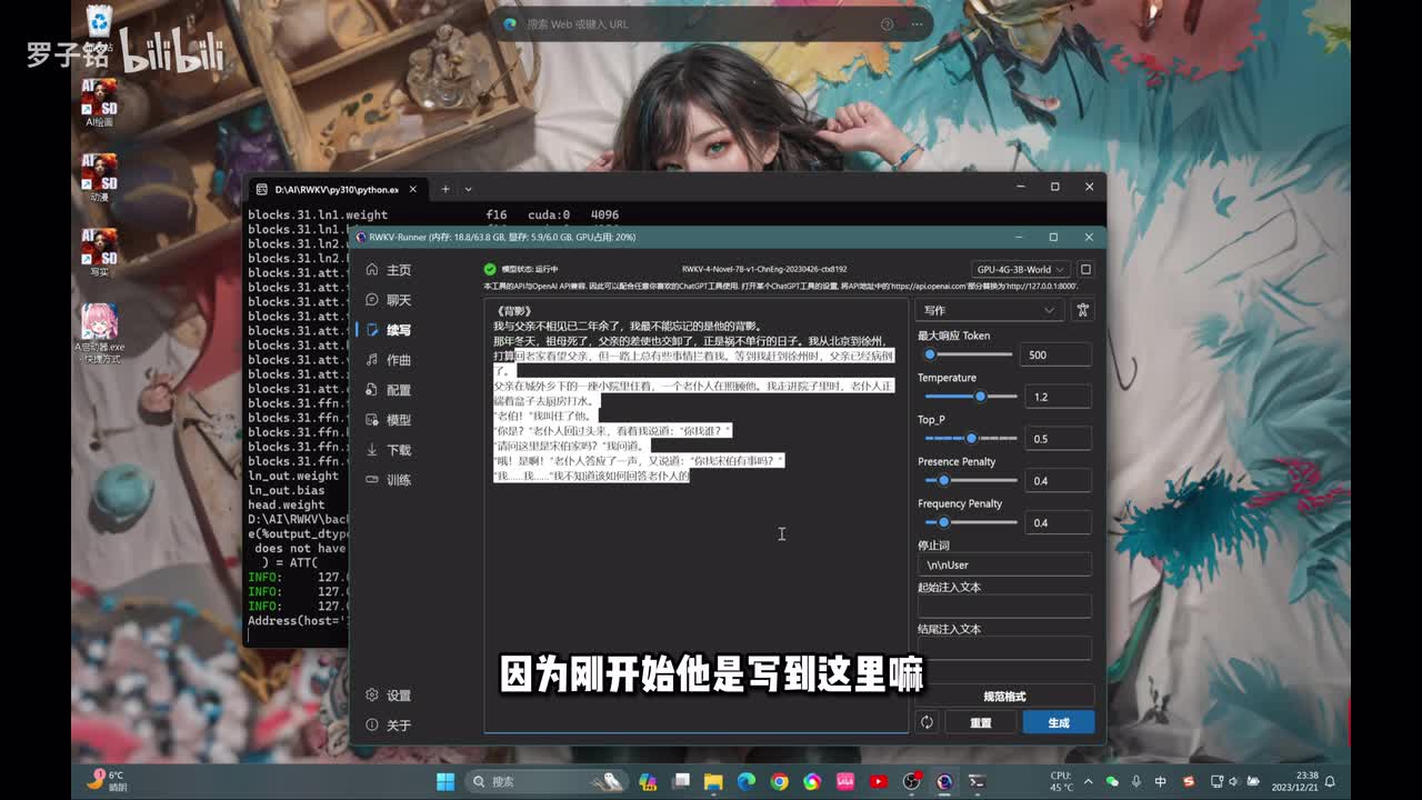 那我们需要回到这个配置找到。这个模型下面的这个第二个选项啊,这个七b的这个呃写作模型o k选完之后,这边要点击停止运行啊。这边显卡层数按照你自己的去去拉就行了,然后tok记得拉到最大啊,这边也是要选择你的显卡,都需要之后点击运行。然后这边看到它已经完成了,我们点击续写啊,这边也是响应速度啊,可以拉到最大。