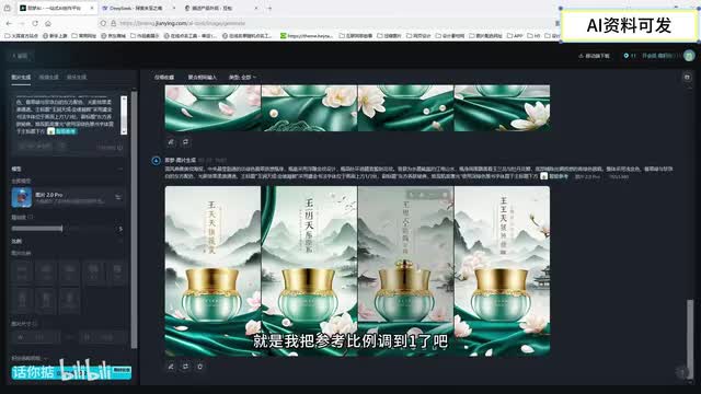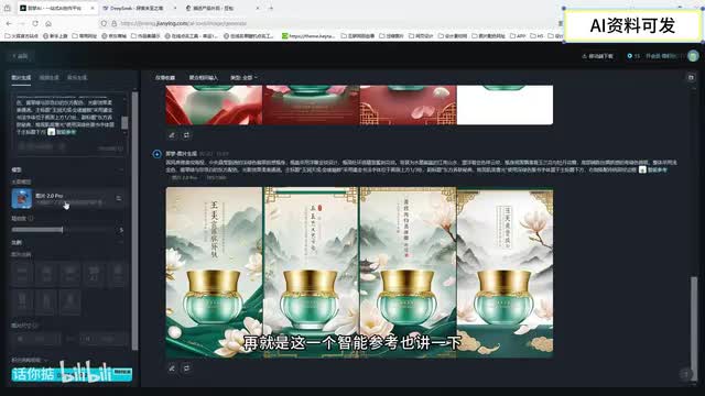 其实这个时候我们可以去给它加入一个中文关键词,就不会带英文了。这里我就不去讲了,直接把英文删掉。然后呢,再把它这个文字排版也给他拿过来。好,我们再来生成。大家可以看一下现在出来的效果,其实它整体的风格跟我们的产品是搭的那大家也可以多去刷新几次,也可以去调整这个关键词。