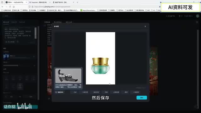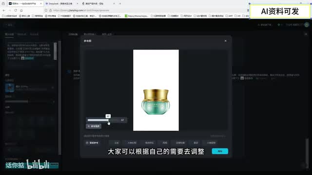 直接生成是这样的,我们还要去导入这一个参考图,这个参考图的话可以在p s里面调成与你生成图的比例是一样的。这里的话直接用智能参考,智能参考的话它这里其实是有解释的。比如换背景颜色或者什么,它会自动根据你的画面去参考好,然后保存,保存了之后我们再来生成。那这个的话就是出来的效果,大家可以看一下,其实它整体可能跟我们这个产品不是特别的搭。那我们再来看一下,带了产品的描述之后,它给我们生成了关键词,现场话是带有英文的。