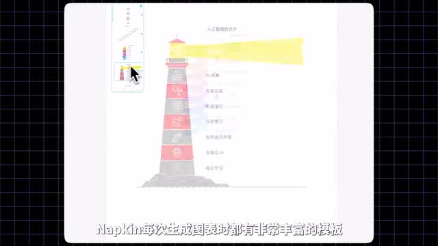 接下来是napkin,这个a i可以将你的文字内容一键转化成可视化的图表,比如说思维导图、时间轴、流程图等等等等。使用起来非常简单,你只需要把文字内容粘贴到的界面,然后点击闪电符号a i就会自动生成相应的图表。如果是文字信息为主,那它会生成逻辑框架图。如果是数据信息为主,那它会生成统计图。