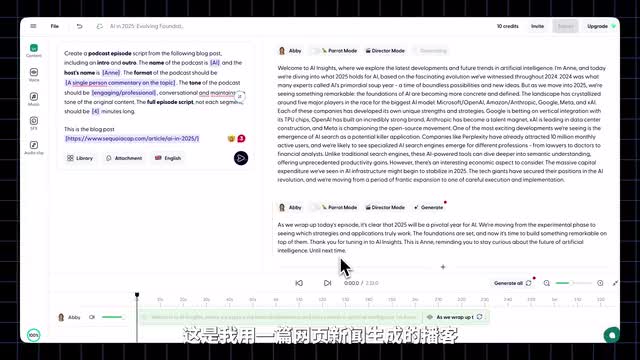 使用呢非常的简单,你只需要根据提示词在方框里面填入相对应的信息。比如说文章的网页链接,想要生成的播客的风格等等等等,就能够一键生成你想要的内容,可以自定义播客的风格时长。那这点我觉得是会比no book l m更好用的,自由度呢更高。这是我用一篇网页新闻生成的播客a i insights,where we explore the latest developments and future trends in artificial intelligence. i am. and today we're diving into what twenty twenty five holds for ai based on the fascinating evolution we've witnessed throughout two thousand and twenty four. 纹身的逼真效果真的非常的不赖。