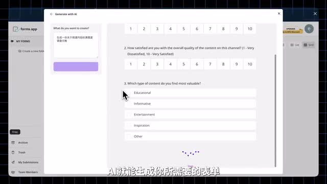 无论是满意度调查表、客户反馈表,还是注册表单、活动报名表、调查问卷等等等等,通通都能够轻松的搞定。输入一个pro提供表单的主题关键要素a i就能够生成你所需要的表单。后续呢你只需要做简单的调整,做好之后就可以把问卷的链接分享给调研的人,非常的方便。这些表单本来是重复且耗时的工作,那有了form点的a i你就不需要再手动输入每一个问题了。