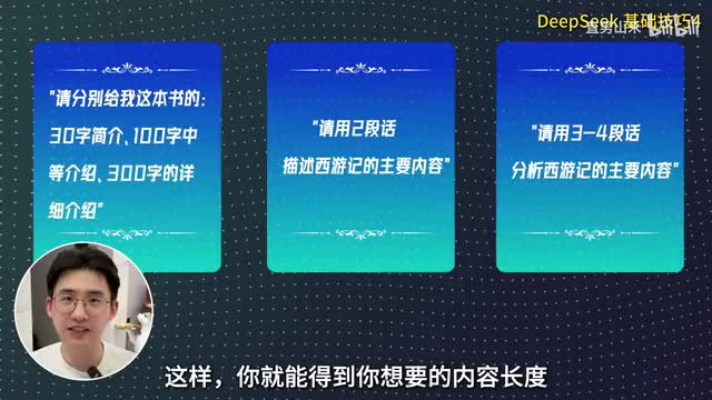 比如,请分别给我这本书的三十字简介、一百字中等介绍、三百字的详细介绍,或者直接用段落数来限制输出内容。比如,请用两段话来介绍西游记的主要内容,请用三到四段话来分析西游记的主要内容,这样你就能得到你想要的内容长度。熟练运用以上四个技巧,你已经入门deep sick能应对大部分日常工作了。三、进阶技巧如果说基础篇是为了让desi k听懂你的指令,那么进阶篇则是让他理解你的意图,与你达成更深层次的默契。进阶技巧一,提供背景信息。