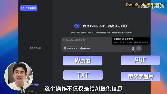 如果你看到视频的时候,联网功能还不能用,你可以直接手动将事件的背景信息发给a i进阶技巧二提供参考。在输入框旁边有一个回形针的图标,点击这里就可以上传文件,这是让ai快速理解背景信息的有效方式。目前dept c支持上传word、p d、f t、s t、带文字的图片等多种格式的文件。这个操作其实不仅仅是给ai提供信息,更是让ai去学习你提供的资料,模仿你提供的风格进行输出。比如说你想写一篇文章,或者是写一个短视频的脚本,你可以上传几篇你写过的文章,或者说你喜欢博主的视频文案,发给他当学习资料,让ai模仿这些语言风格进行创作,你会给他的资料越多,它写出来的风格就越接近你想要的效果。
