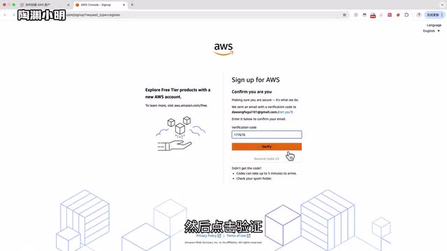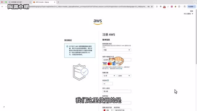 下面要填写一些联系人信息,然后电话我们选择国内手机号,地区选择中国。下面需要输入地址信息,包括城市、省、邮编,再点击继续。那接下来我们需要填写一个账单信息,大家不用担心,我们这里使用的是亚马逊云科技的免费试用产品,所以不会产生扣费。那他只是为了验证一下这个卡的有效性,然后最多可能扣除一美元,三到五天之内呢还会把这个钱给我们返回来。国家这里选择中国,然后信用卡这里可以使用国内的银联信用卡。