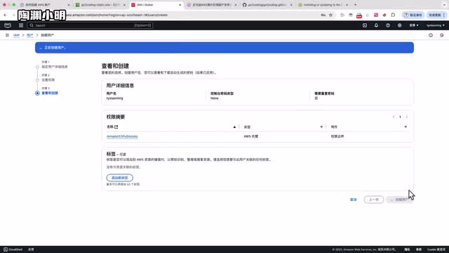 首先呢我们需要去获取一个a p p i d和a p i k,这是用来和这个s三存储桶进行身份认证的。我们回到控制台,然后在这里搜索这个i a m,创建一个用户。然后打开创建的用户。点击这里创建一个密钥。创建完成以后,我们点击下载这个c s v文件,我们创建的这个a p p i d和a p i k就存在这里面。