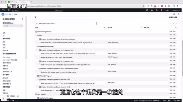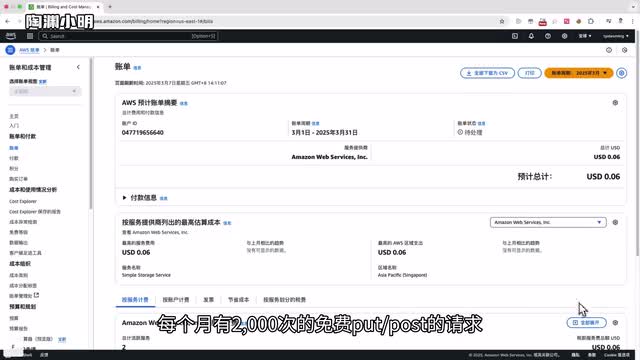 先把这个项目代码克隆到本地。执行完成了,我们c d进入到项目文件夹中。接下来我们去创建一个s三的存储桶。在这里点击所有服务,然后打开这个s三存储,点击这里呢可以查看定价,向下拉,然后点击这个免费套餐。滑到下面可以看到这个m三三s三是可以免费试用十二个月的,每个月呢有免费的五g b存储,以及两万次的get请求和两千次的put post请求。