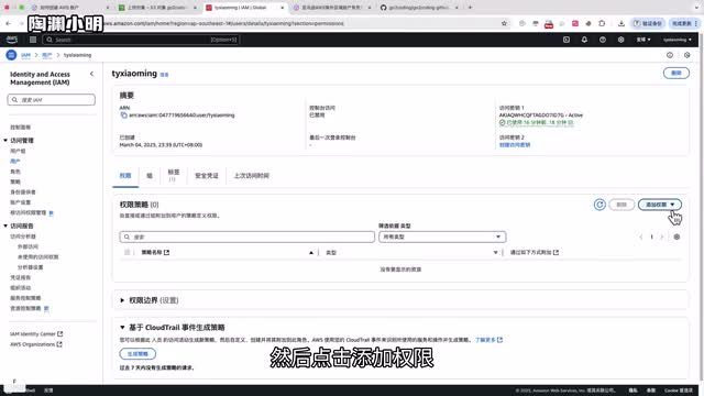 报错了,它提示我们这个用户没有操作权限。我们打开刚才创建的那个用户。然后点击添加权限。这里选择直接附加。然后把这个s三存储的全部权限都给它添加上去。