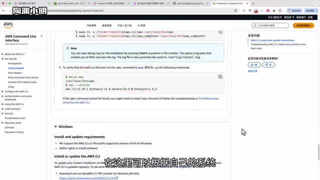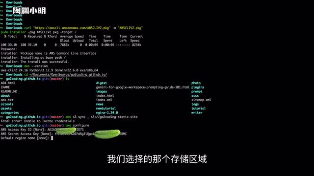 那存储桶配置好以后,我们接下来要把项目中的静态网站文件上传到存储桶这里。我们需要先安装这个上传用的命令行工具。我们打开这个网址,在这里呢可以根据自己的系统来查看安装的操作步骤。我这里是mac系统,然后复制这个安装命令执行它。安装完成了,接下来我们使用它来把网站文件上传上去。